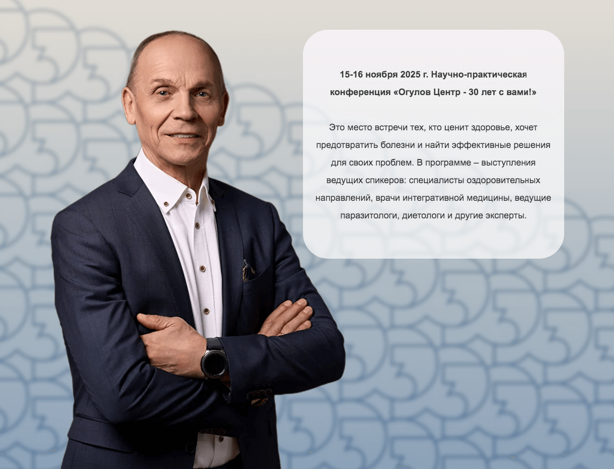 С 15 по 16 ноября 2025 в Москве пройдет юбилейная научно-практическая конференция «Огулов Центр — 30 лет с вами!». В программе – выступления ведущих спикеров: специалисты оздоровительных направлений, врачи интегративной медицины, ведущие паразитологи, диетологи и другие эксперты.